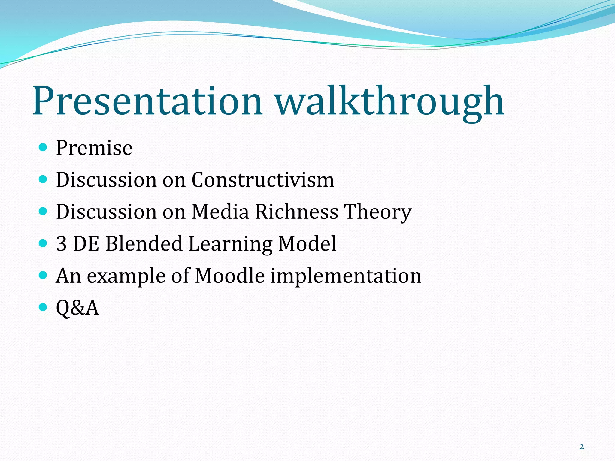 The document discusses blended learning models and their advantages. It begins by discussing constructivism and how students construct their own knowledge from various sources. It also discusses media richness theory and how technology can enhance learning through rich media similar to face-to-face interactions. A 3-D grounded praxis model is described for traditional classrooms, while a 3-E pure e-learning model allows for synchronous and asynchronous online learning. A proposed 3-DE blended learning model combines the benefits of both by adding online and virtual interactions to contextual, choice-based, networked learning. This model aligns with constructivism and media richness theory by reducing geographic barriers through collaboration over networks. A case study demonstrates implementing this model through Moodle