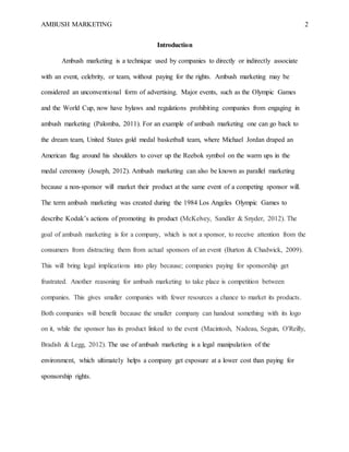 This document discusses ambush marketing, which is when companies associate themselves with events or celebrities without paying for sponsorship rights. It provides examples of ambush marketing at the Olympics. The document argues that ambush marketing provides competition for large sponsors and allows smaller companies to market at lower costs. While sometimes seen as unethical, the document claims ambush marketing is a legal tactic as long as companies do not use prohibited words or infringe on trademarks. Forms of legal ambush marketing include advertisements near events and using athletes to promote brands. Overall, the document takes a pro-ambush marketing stance, arguing it creates competition and opportunities for companies in an otherwise restrictive sponsorship environment.