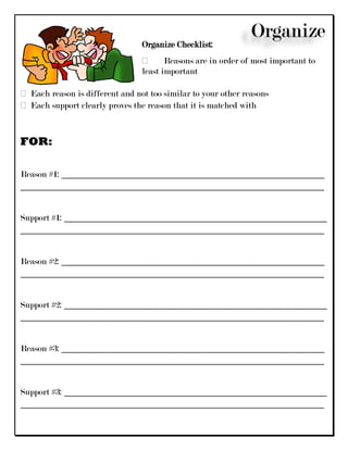 This document provides templates and checklists to help students organize an argument for a debate topic. It includes sections to brainstorm potential reasons for and against a topic, organize the strongest reasons and supporting evidence, and develop rebuttals against opposing arguments. The goal is to help students structure an effective debate argument by systematically considering different perspectives and supporting their own position.