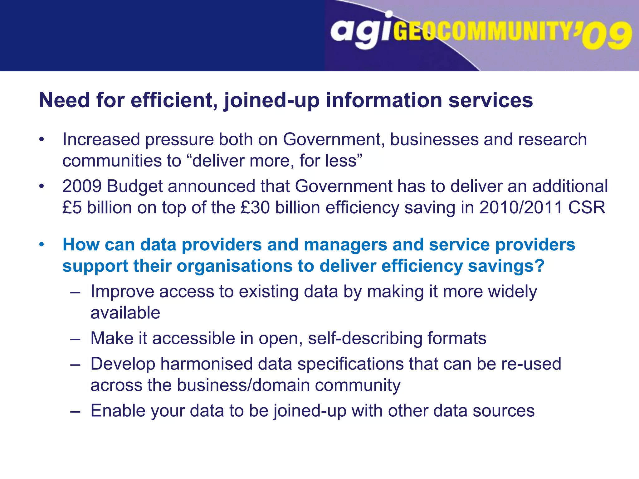 Improved data management and sharing through the use of harmonized data specifications and open standards can enable organizations to deliver services more efficiently with reduced costs. Specifications like INSPIRE define common modeling approaches for environmental data that allow data to be joined from different sources. Case studies show how the Met Office and Land Registry leveraged such standards to build new data services quickly and transform legacy systems. Adopting modular, model-driven approaches facilitates the rapid development and deployment of applications to meet new business and user needs.