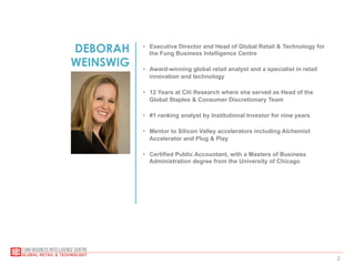 This document provides an overview of omnichannel trends from the perspective of Deborah Weinswig, Executive Director and Head of Global Retail & Technology at the Fung Business Intelligence Centre. The summary is as follows: