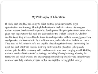 Deborah Baker believes that every child can reach their potential given the right opportunities and developmentally appropriate instruction with high expectations. She emphasizes student-centered learning that focuses on student success. Her philosophy is to ensure students feel cared for, believed in, and supported to reach their learning goals and dreams. She provides experiences to help students gain skills to compete in a changing world, including guiding safe technology use and encouraging collaboration.