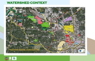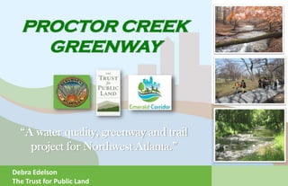 This document summarizes a project to improve water quality in Proctor Creek in Atlanta through creating a greenway and trails, while addressing issues like flooded homes, pollution, and disconnected neighborhoods. The project will be led by The Trust for Public Land and Emerald Corridor, funded through philanthropy and mitigation banking. It will involve stabilizing stream banks, removing pollutants, and adding stormwater management facilities over the next few years to transform the area and connect communities.