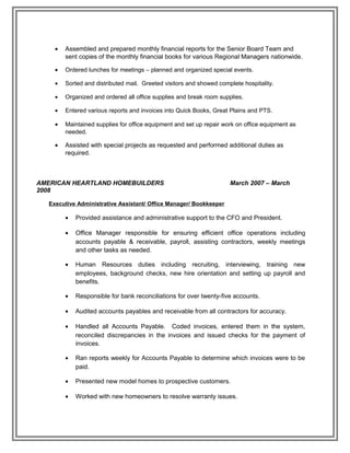 This document provides a summary of Debra Runyon's contact information, professional experience, education, and computer skills. She has over 15 years of experience in executive administrative support, human resources, accounts payable/receivable, and office management. Her experience includes providing support to C-level executives, managing payroll and financial reporting, and ensuring smooth daily operations. She is proficient in Microsoft Office, accounting software, and customer relationship management tools.