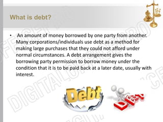 The document discusses debt management in Pakistan, explaining that debt is money borrowed under an agreement to be repaid with interest. It highlights the types of debt such as public, domestic, and external, and the importance of effective management to avoid negative impacts on economic growth and public services. The report also analyzes current debt statistics, including the growing trend in domestic debt composition and the government's challenge in maintaining debt levels within legal limits set by fiscal responsibility regulations.