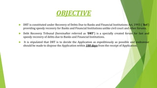 The document provides a comprehensive overview of the Debt Recovery Tribunal (DRT) established under the Recovery of Debts Due to Banks and Financial Institutions Act, 1993, designed for swift resolution of debt recovery cases. It outlines the composition, jurisdiction, and procedural details concerning filing applications, interim relief measures, and the roles of various officials within the DRT, emphasizing a streamlined process for recovering dues from borrowers. Additionally, it discusses the publication of defaulters' names and the appeal process against DRT decisions, reinforcing the DRT's exclusive authority in debt recovery matters.