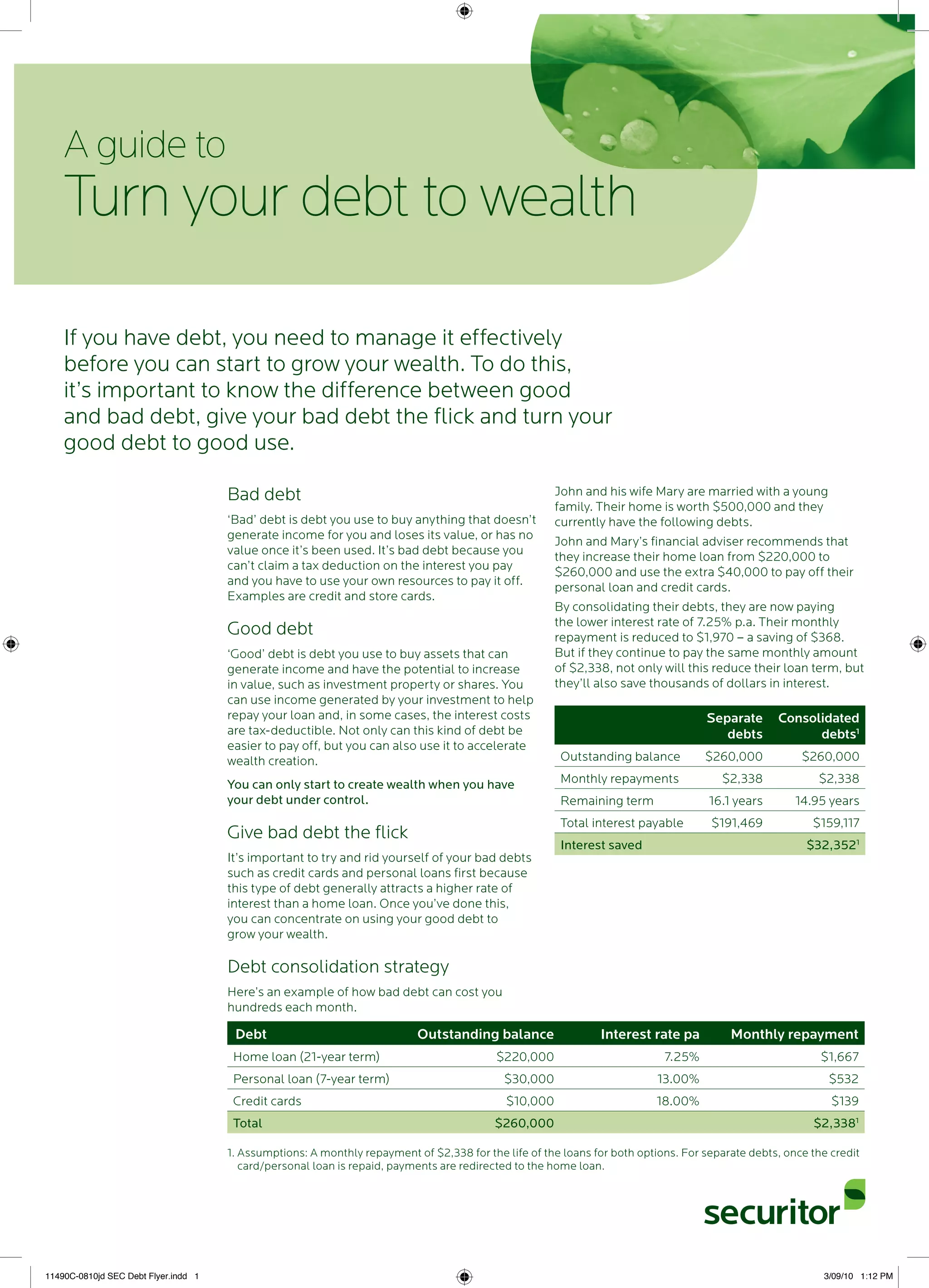 The document explains the distinction between 'bad debt', which incurs high interest and does not generate income, and 'good debt', which is used for investment purposes and can lead to wealth creation. It emphasizes the importance of eliminating bad debts first and managing debts effectively through strategies like debt consolidation and debt recycling to accelerate wealth growth. Additionally, it outlines the benefits of using a mortgage offset account versus a conventional bank account for savings and the concept of gearing for investment purposes.