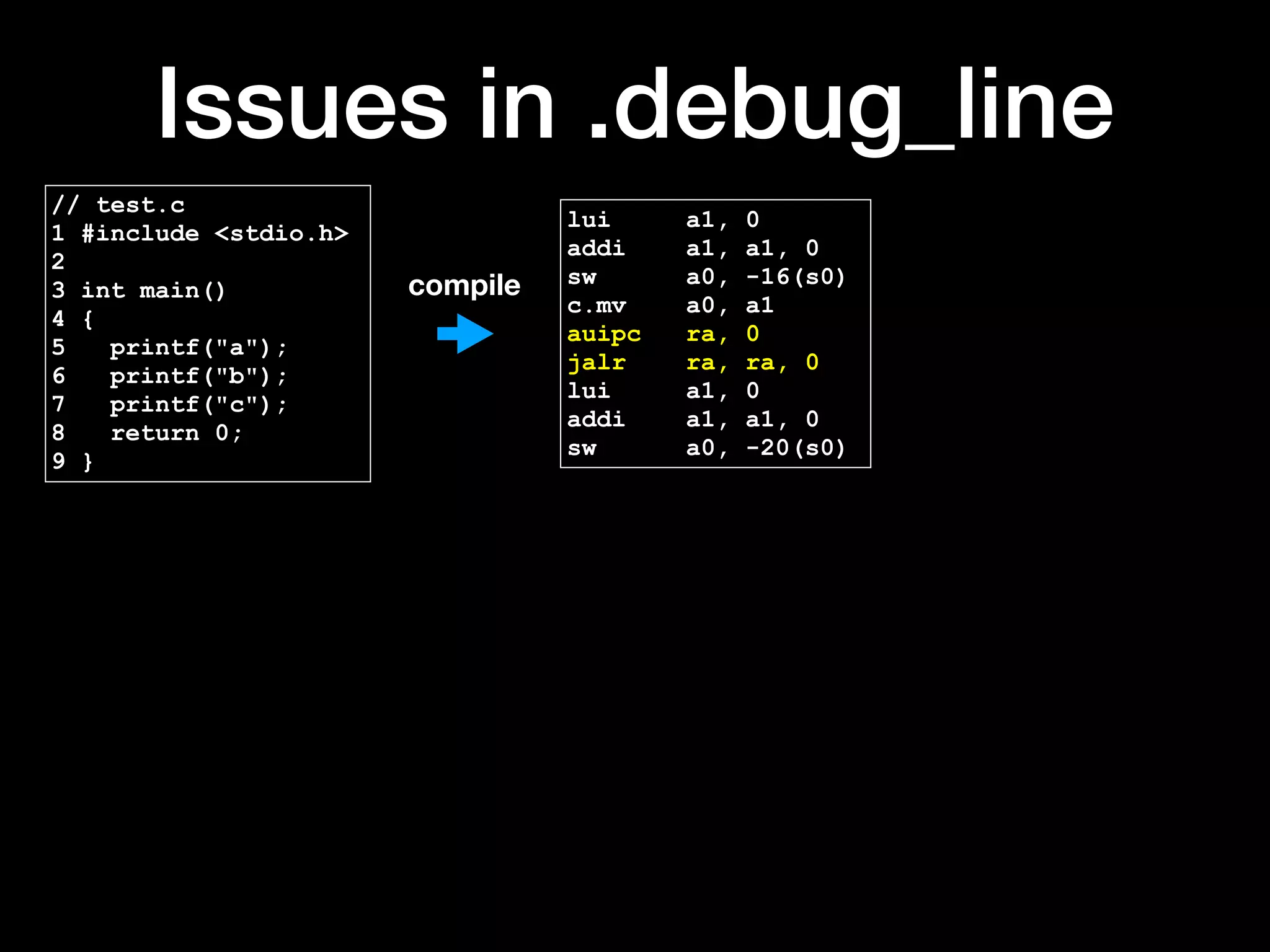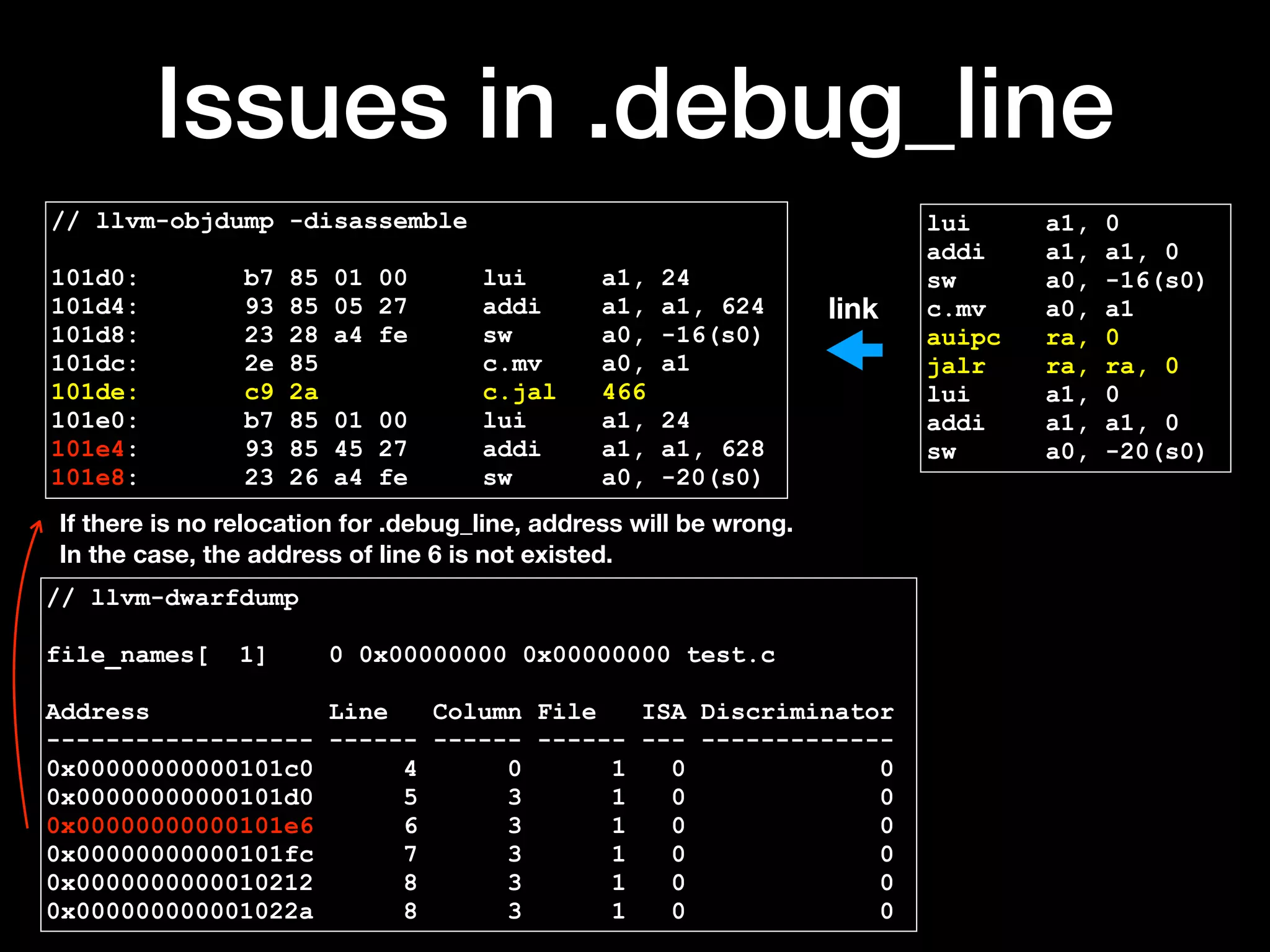 The document discusses issues with line number information in the .debug_line section when relocation is not applied properly. It shows a C program with line number information extracted using llvm-dwarfdump and llvm-objdump. Setting a breakpoint at line 6 fails as the address is incorrect without relocation applied to .debug_line. Precise line number information relies on correct address information in .debug_line.