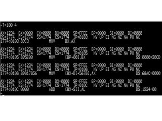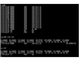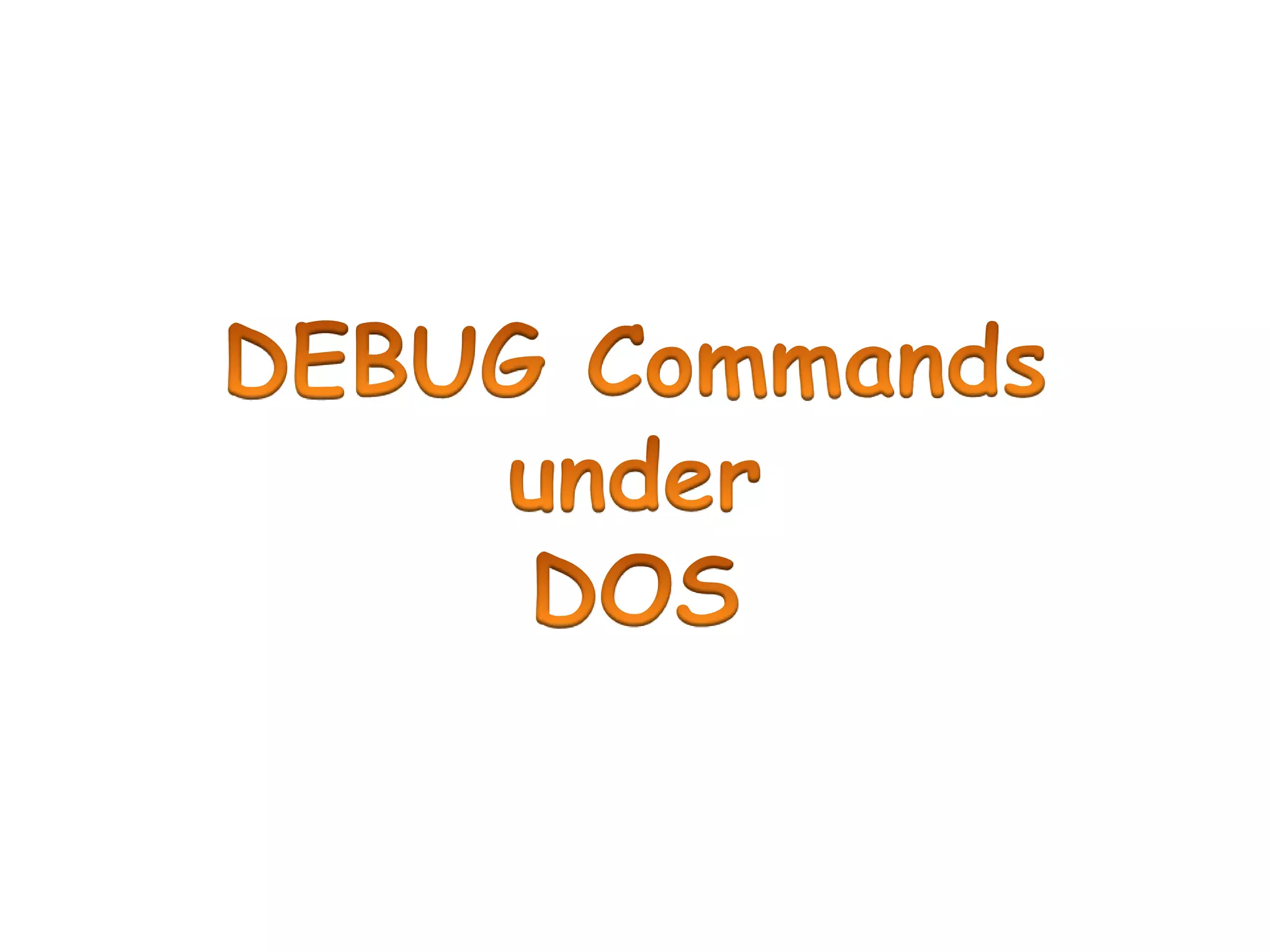 This document provides syntax and usage instructions for various commands in a DEBUG program. It describes commands for assembling code, disassembling code, dumping memory contents, filling memory, tracing CPU instructions, running programs with breakpoints, performing basic hex calculations, and quitting the program. The commands take hexadecimal addresses, ranges, values, and optional parameters like the number of instructions or bytes.