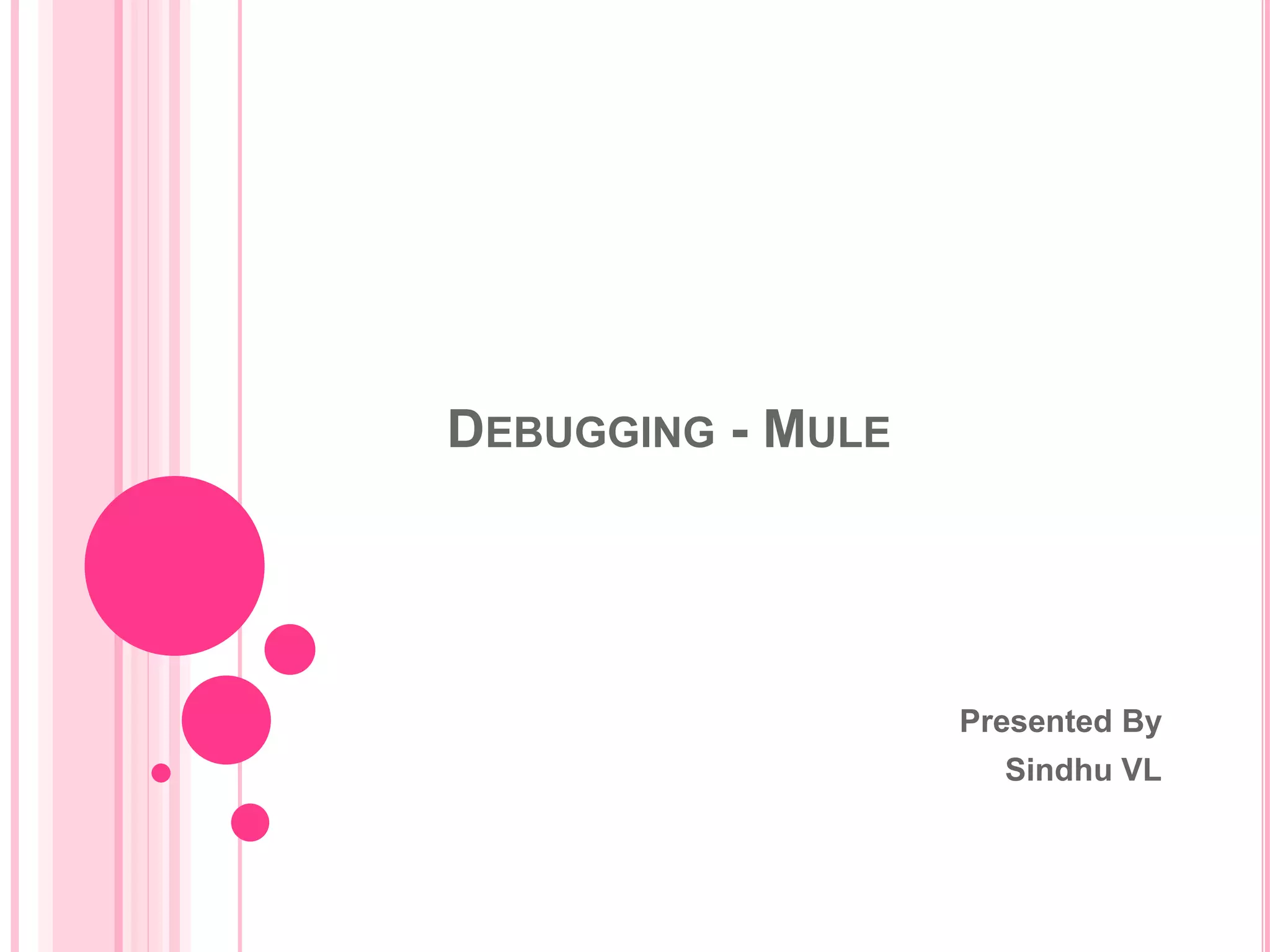 This document describes debugging techniques for Mule applications, including the Studio Visual Debugger, troubleshooting, and logging. The Visual Debugger allows setting breakpoints to inspect message contents at different points in a flow. To use it, set breakpoints, run in debug mode, and view message data. Troubleshooting techniques include configuring stacktraces, debugging outside Studio by enabling remote debugging, and using log statements. Logging is useful to follow an application's state by tracking messages through the flow.