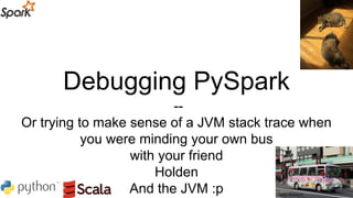 This document discusses debugging in PySpark, highlighting the complexities of distributed and mixed-language systems while providing various strategies for identifying and resolving issues, including effective use of logs and error messages. Key themes include understanding Spark's architecture, handling JVM stack traces, and leveraging tools like Spark Testing Base for better coding practices. Emphasis is placed on the importance of testing and iterative debugging methods to navigate typical pitfalls.