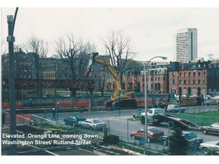 The document summarizes the revitalization of Washington Street in Boston from the late 20th century to present day. It describes how the elevated Orange Line was removed in 1985, opening up the area for redevelopment. A task force was formed in 1995 that worked with the city to create a plan to rezone the area and attract new development through improved transportation including the Silver Line bus system. Since then over 1,900 new housing units and retail have been built, transforming the area from one in decline to a densely populated transitoriented neighborhood through public-private partnerships.