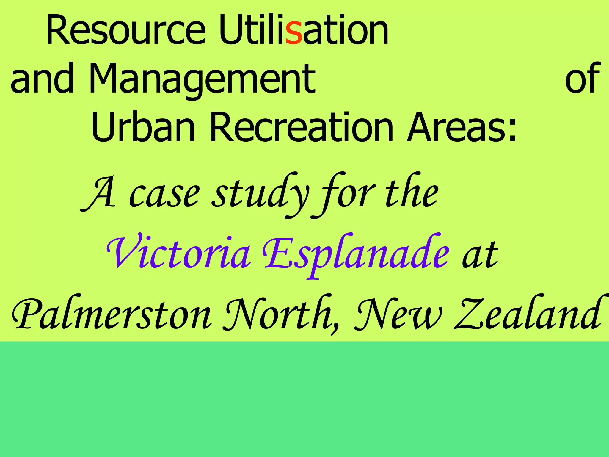 This document provides details about a case study examining the resource utilization and management of the Victoria Esplanade urban recreation area in Palmerston North, New Zealand. It discusses the park's natural and human elements, presents the research problem and objectives, and outlines the methodology used which included surveys of park visitors. Key findings are summarized such as the dominant demographics of visitors and how usage varies over time and space. Limitations and implications for park management are also noted.