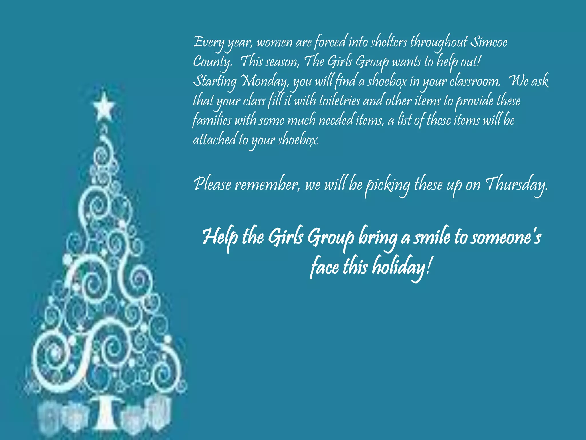 The Girls Group is collecting toiletries and other items in shoeboxes distributed to classrooms starting Monday to donate to families in Simcoe County women's shelters for the holidays. Students are asked to fill the shoeboxes with donated items from the provided list, and the Girls Group will collect the filled boxes this Thursday to help bring smiles to people's faces during the season.