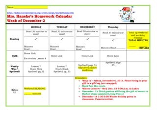 This document contains a weekly schedule for a third grade class. It lists the subjects and activities for each day of the week, including 30 minutes of daily reading and homework. It also notes that a gift wrap event, book fair, winter concert, assisted living visit, and holiday party are upcoming. Initials and minutes of reading are to be recorded and totaled for the week.