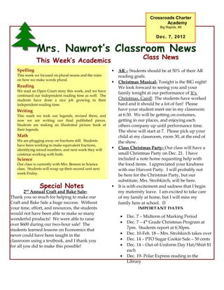 - Upcoming events include a class Christmas party, craft and bake sale follow up, and other December dates like midterms and a PTO cookie sale.