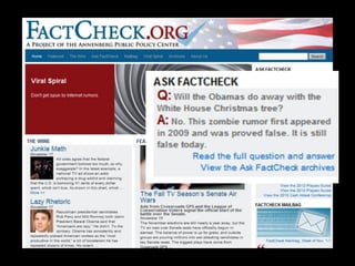 This document provides an overview of news literacy in the information age. It discusses the advantages and disadvantages of finding information online, how to identify reliable sources, and how to minimize disadvantages. Key points include: the growth of internet usage, top news sites, information overload online, challenges like inaccurate information and blurred lines between news and opinion, and how to evaluate websites based on factors like date of content, citations, independence, and transparency of authorship. The document emphasizes that popularity and speed do not guarantee reliability and provides tips for fact checking information found online.