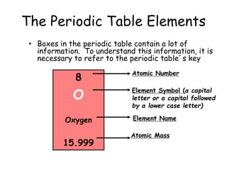 - The periodic table contains information about each element, including the element symbol, name, atomic number, and atomic mass. The atomic number is the number of protons in an atom's nucleus, while the atomic mass takes into account the total number of protons and neutrons.
