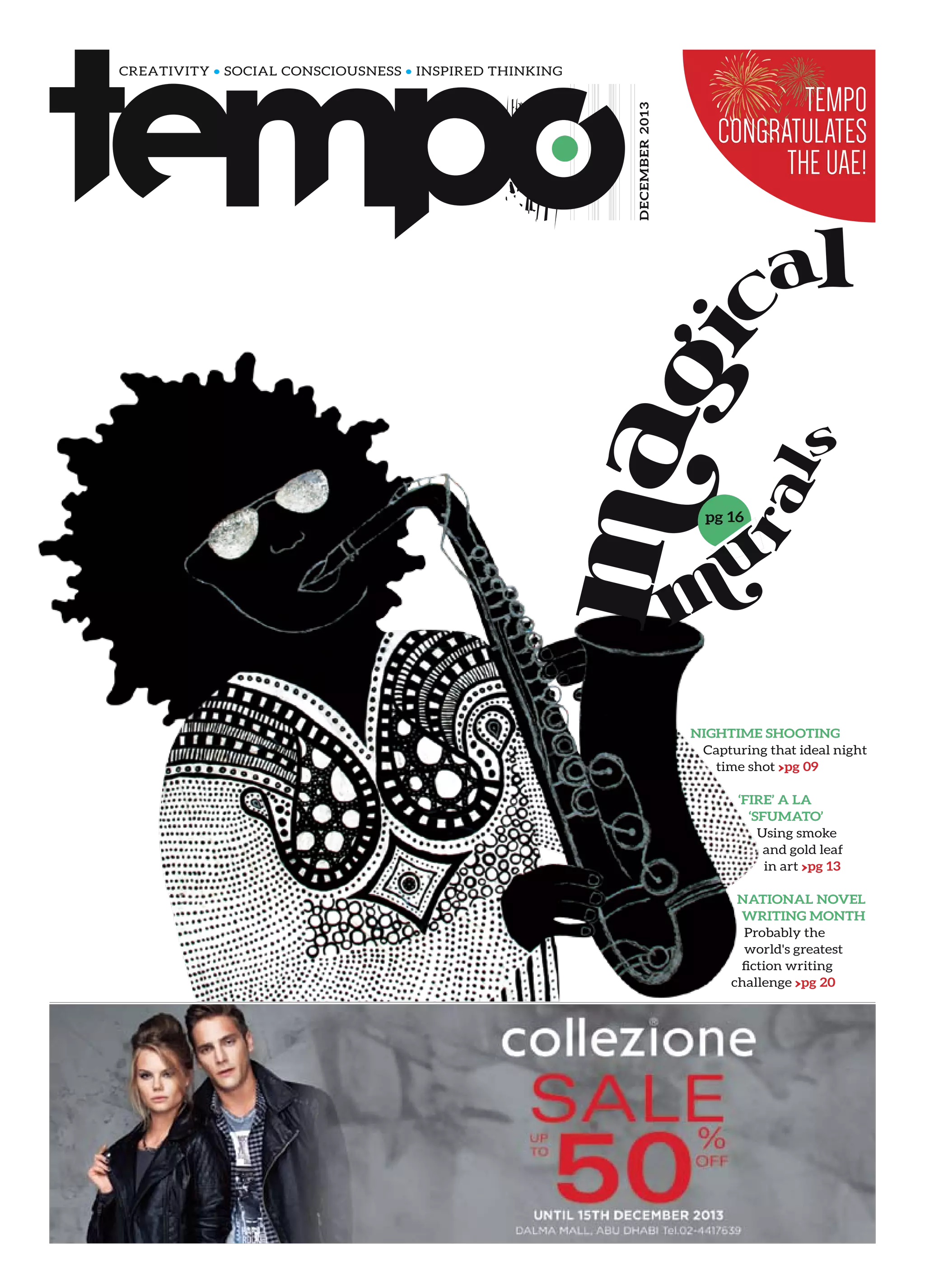 The document is an editorial for the December 2013 issue of Tempo magazine, highlighting various cultural and literary topics, events, and community activities in the UAE. It includes contributions from multiple writers, coverage of events like the Dubai International Film Festival, and features on topics such as creative writing and art. The magazine aims to inspire readers and foster connections, particularly as the year comes to a close.