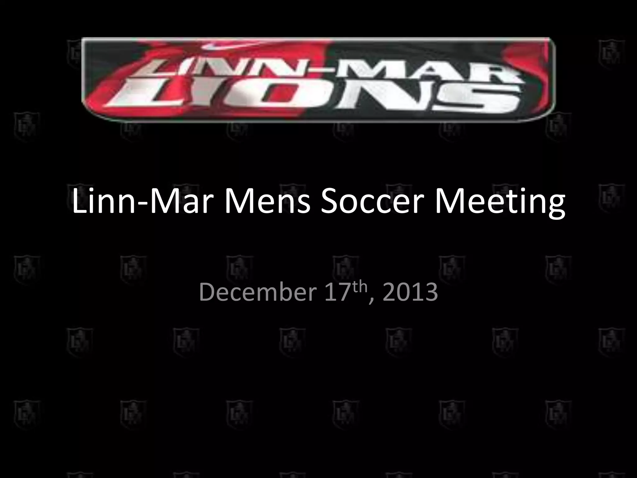 This document summarizes the December 17th, 2013 Linn-Mar Mens Soccer meeting. The agenda covered player and parent expectations, team guidelines, sportsmanship policies, equipment requirements, pre-season workouts, ordering deadlines, and methods of communication for the upcoming soccer season. Player registration forms, physicals, code of conduct agreements, and payment for apparel and meals were due by specified deadlines in January and March.