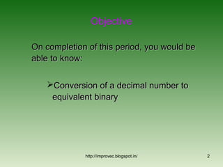 The document discusses converting decimal numbers to binary numbers. It explains that the integer and fractional parts of a decimal number are dealt with separately. To convert the integer part, the number is repeatedly divided by 2 and the remainders are written down and taken in reverse order to form the binary number. To convert the fractional part, the number is repeatedly multiplied by 2 and the integer parts are taken in forward order. Examples are provided of converting the decimal numbers 125, 0.4375, and 17.35 to their equivalent binary numbers.