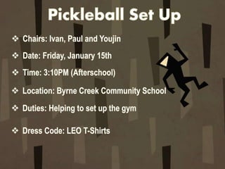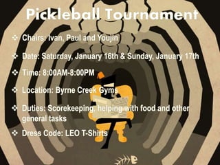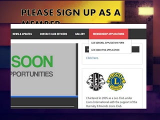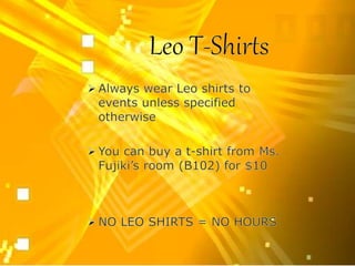 The document summarizes an upcoming Leo Club meeting on December 15th, 2015. It lists volunteer opportunities for various events, including a Canadian Blood Service drive, a Christmas celebration, and a Christmas luncheon. It also provides details about an upcoming hot dog sale fundraiser on December 16th and lists volunteers. Future events discussed include an international student orientation on January 25th-26th and an international student get-together day on January 27th.
