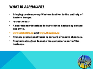 Alphalife is a startup that aims to bring contemporary Western fashion to Eastern Europe by establishing an online retail presence in Russia. It will operate two websites - Alphalife.ru and TheZone.ru - to sell clothing from popular Western brands. The company plans to rent a warehouse and office in Moscow and hire staff to source inventory, develop the websites, and promote the brand through word-of-mouth campaigns that engage customers. It projects net profits of $300,000 in the first year as it works to establish the brand in the growing Russian e-commerce market.
