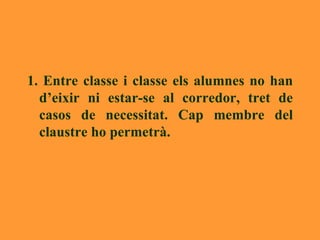 1. Entre classei classe els alumnes no han d’eixir ni estar-se al corredor, tret de casos de necessitat. Cap membre del claustre ho permetrà.