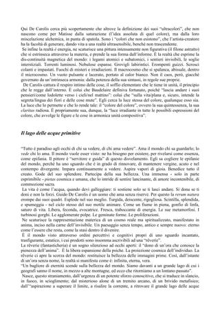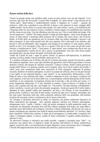 Il documento esplora il concetto di 'puro artista' secondo Dino Campana e applicato a Guido De Carolis, descrivendo come l'artista si immerga nella vita per esprimere la bellezza attraverso la sua pittura. De Carolis è visto come un alchimista della luce e della natura, capace di evocare emozioni profonde e connessioni spirituali attraverso il suo lavoro, che riflette il ciclo vitale e l'energia del mondo. La sua arte è un atto di amore e scoperta, che risveglia la meraviglia infantile e il legame primordiale con la realtà.