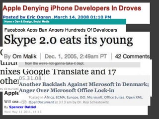 The document discusses the challenges developers face when building on platforms owned by larger entities that may eventually compete with them. Fred Wilson emphasizes that developers should be prepared for platform owners to act against their interests, potentially jeopardizing their own applications. The conversation highlights the dynamics of power in consumer-facing technology and the importance of clear communication and boundaries.