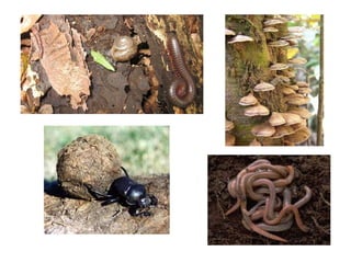 Decomposers like mushrooms, worms and bugs play an important role in decay and decomposition by breaking down dead organisms and converting them into soil. For decay to occur, certain conditions need to be present including warmth, moisture and oxygen. Without decomposers, dead organisms would accumulate and the world would be covered in remains rather than recycled into dirt.