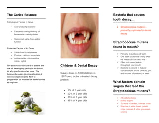 Tooth decay is a transmittable disease caused by bacteria in the mouth that feed on sugars and produce acid, leading to demineralization of enamel over multiple acid attacks. The balance between protective saliva factors and pathological acid-producing bacteria and frequent sugar consumption determines the risk of developing caries. A 1997 survey found that untreated tooth decay was present in 6% of 1-year-olds, rising to 48% of 4-year-olds, showing the importance of preventing decay in young children.