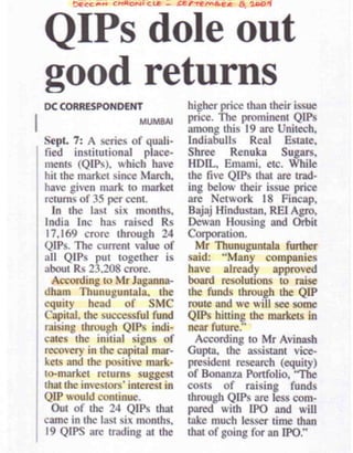 The successful fund raising through QIPs indicates the initial signs of recovery in the capital markets and the positive mark-to-market returns suggest that the investors’ interest in QIP would continue, said Mr Jagannadham Thunuguntala, the equity head of SMC Capital.