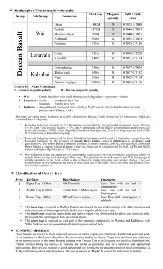 The Deccan Trap is a significant geological formation in India, characterized by extensive flood basalt deposits created by volcanic activity approximately 65 million years ago. It features layered structures, magnetic polarity variations, and intertrappean beds containing fossils, marking its stratigraphy and geological history. The formation has implications for climate change due to the release of volcanic gases and is associated with significant mineral resources such as native copper and agricultural soil known as 'regur.'