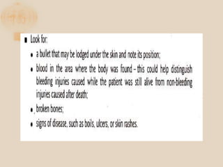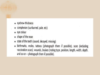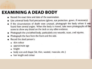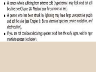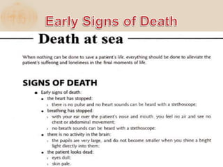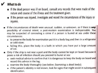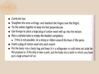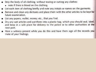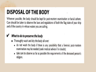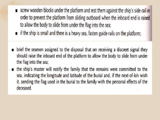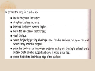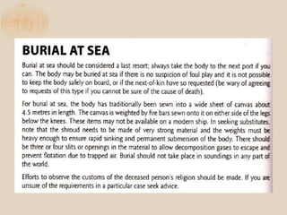 The document discusses the proper procedures for handling deceased persons during search and rescue operations. It outlines steps such as not disturbing remains at a crash site without authorization, attempting to identify deceased persons without endangering rescuers, keeping any articles found with remains separated and labeled, and creating a waybill for remains with the deceased's name and details. The document also notes considerations for transporting remains, including using body bags on vessels, keeping remains wrapped if on board for long periods, and handing remains over to authorities accompanied by the waybill immediately upon return to base.