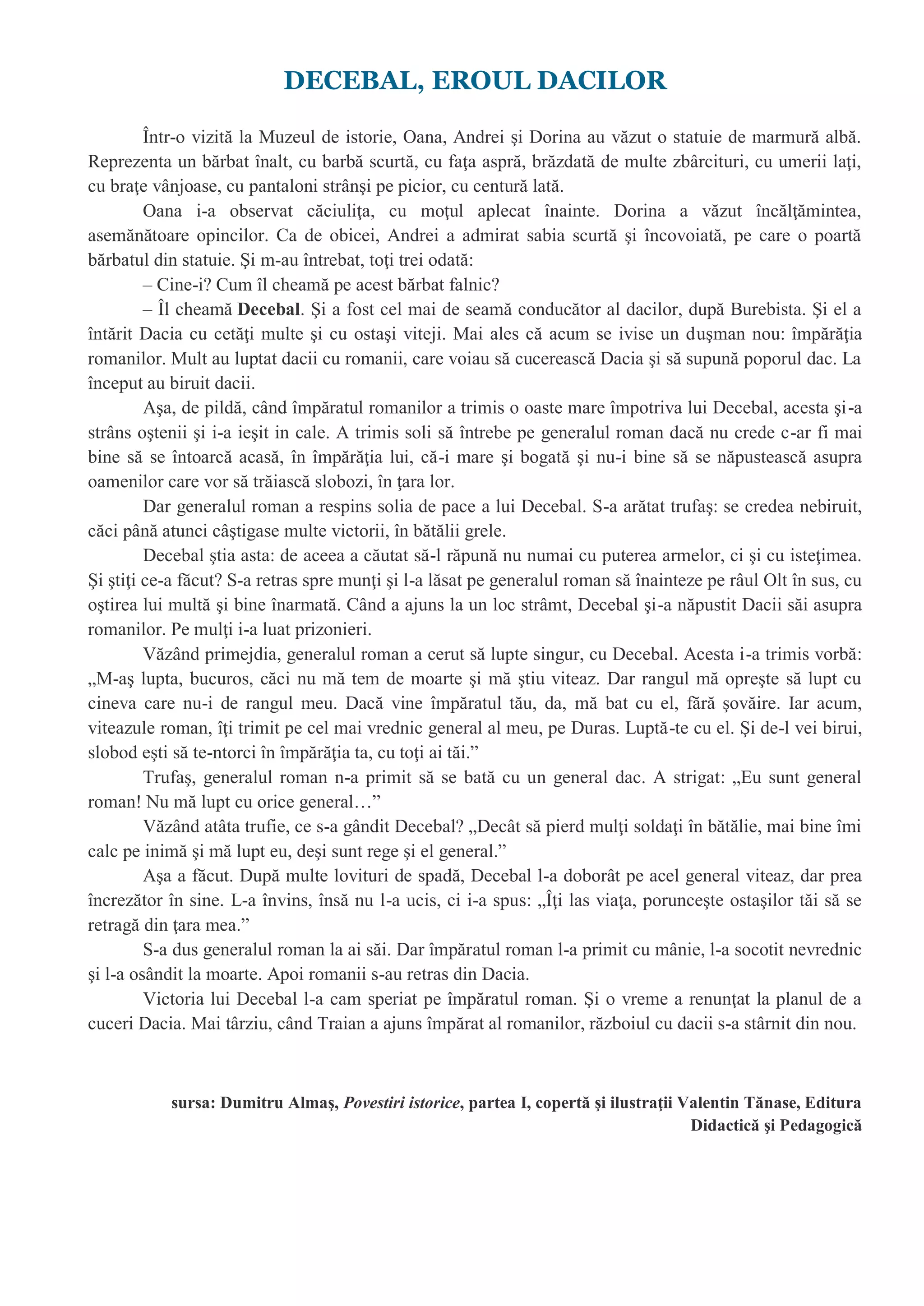 Documentul prezintă figura lui Decebal, conducătorul dacilor, și descrie o vizită la un muzeu unde a fost admirată o statuie a acestuia. Decebal a luptat împotriva romanilor, fiind cunoscut pentru strategia sa isteață, care a condus la înfrângerea unui general roman într-o bătălie crucială. Deși a obținut victoria, războiul cu romanii a continuat ulterior sub regiunea lui Traian.