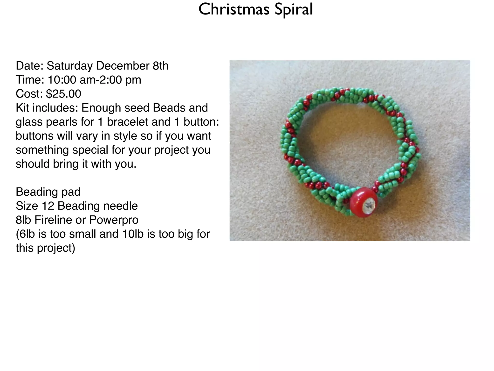 [1] A Christmas spiral bead bracelet class on December 8th for $25, which includes materials for one bracelet and button. [2] A beginning silver art clay charm-making class on December 9th for $55 plus $35 for materials, where students can make holiday or other charms. [3] A wire wrap bracelet class on December 16th for $20 using various wire gauges. [4] A chainmaille pendant class on December 30th for $35, which includes materials to make a pendant. The document also notes there will be no open bead day and wishes everyone happy holidays.