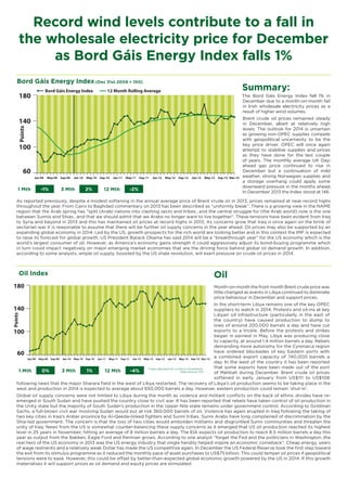The Bord Gáis Energy Index fell 1% in December due to lower Irish wholesale electricity prices as a result of higher wind volumes which reduced costs. Brent crude oil prices were steady in December due to ongoing conflicts and supply disruptions in Libya and other regions. Natural gas and coal prices in Europe rose slightly over the month while the euro remained steady against the US dollar and British pound.