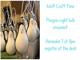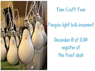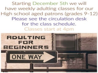 The document lists the December programs and schedule for a public library. It provides the hours of operation from Monday through Thursday, Friday, and Saturday. It also notes the library is closed on Sundays. Several children's, tween/teen, and adult programs are listed for different times on various weekdays and dates in December. It concludes with information about the Board of Trustees meeting on December 19th at 5:30 pm and rules for public participation.