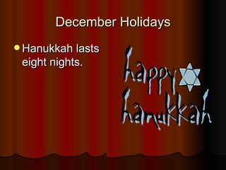 The document discusses three December holidays: Hanukkah lasts eight nights and commemorates a miracle where oil burned for eight nights instead of one; the menorah is used during Hanukkah and has nine candles including the helper candle called the shammash; Kwanzaa is celebrated by African Americans in December and uses a candleholder called a kinara.