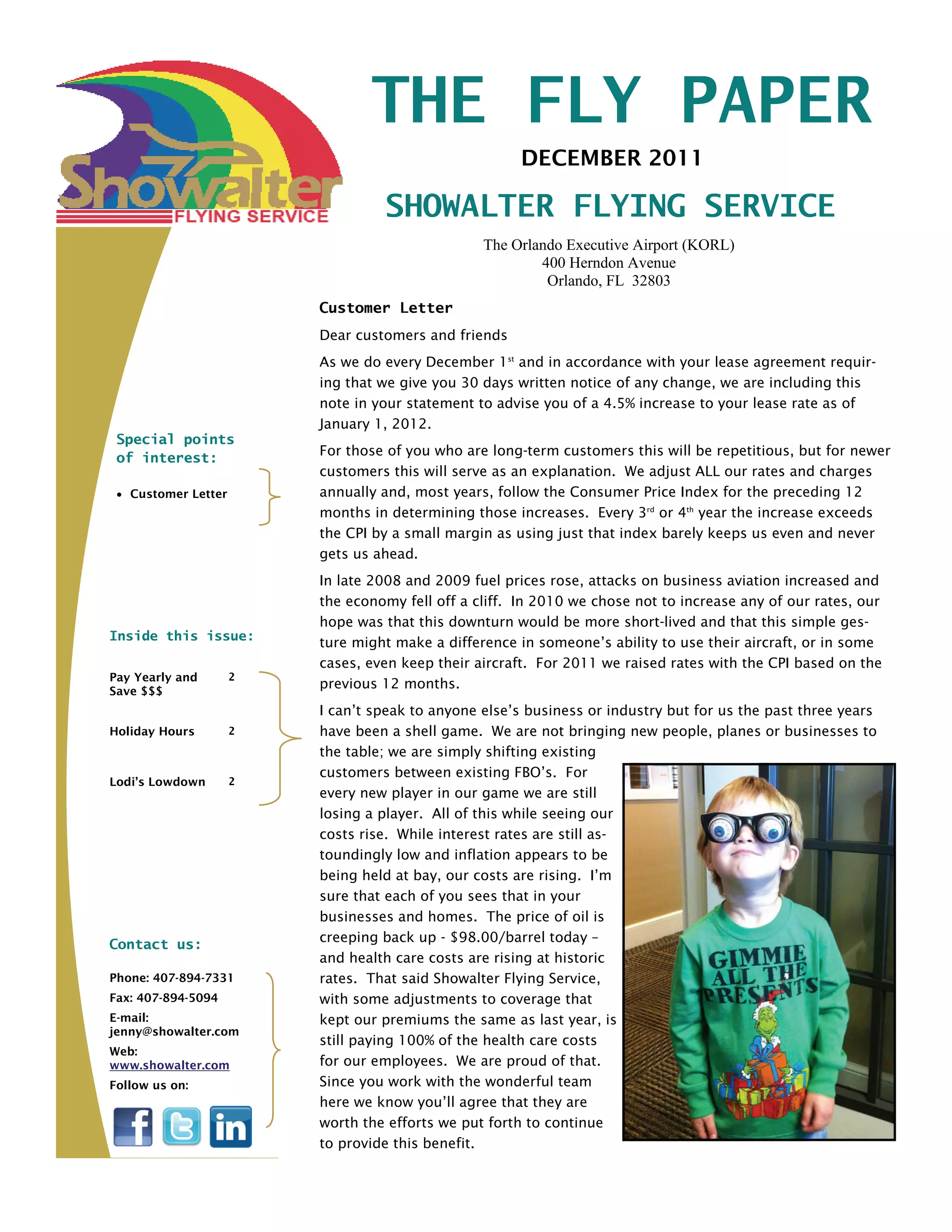The document is a newsletter from Showalter Flying Service announcing a 4.5% increase in lease rates effective January 1, 2012. It explains that rates are adjusted annually to keep up with costs like fuel and healthcare, which have risen in recent years. It also advertises savings of 10% for customers who pay their hangar or tie-down fees for the full year upfront instead of monthly.