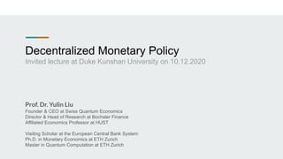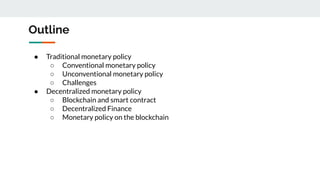 This document summarizes a lecture on decentralized monetary policy given by Prof. Dr. Yulin Liu. It begins with an overview of traditional monetary policy approaches, including conventional tools like interest rates and unconventional tools used during the financial crisis like quantitative easing. It notes challenges like rising inequality and the loss of central bank independence with unconventional policies. The second half introduces decentralized monetary policy concepts using blockchain and cryptocurrencies, including decentralized finance applications like stablecoins and lending protocols. It describes how protocols like Ampleforth implement an automatic, decentralized form of monetary policy through expanding or contracting the token supply to target a price level.