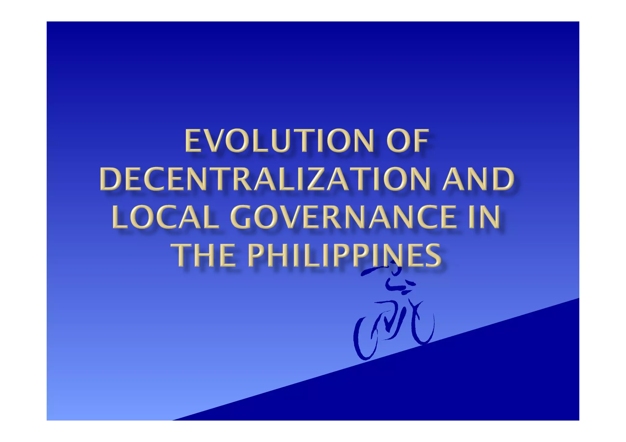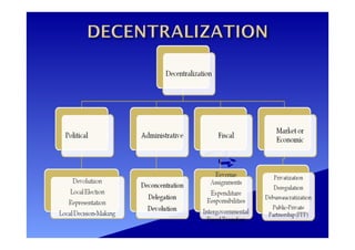 The document discusses the framework of governance and decentralization in the Philippines, emphasizing good governance principles such as accountability, participation, and transparency. It outlines the historical evolution of local governance, particularly the decentralization movements from the pre-Hispanic era to the post-Marcos period, highlighting the role of various administrations in reforming local government structures. Key components of effective local governance, financial management, and citizen engagement are also presented, discussing the responsibilities of local government units in service delivery and economic development.
