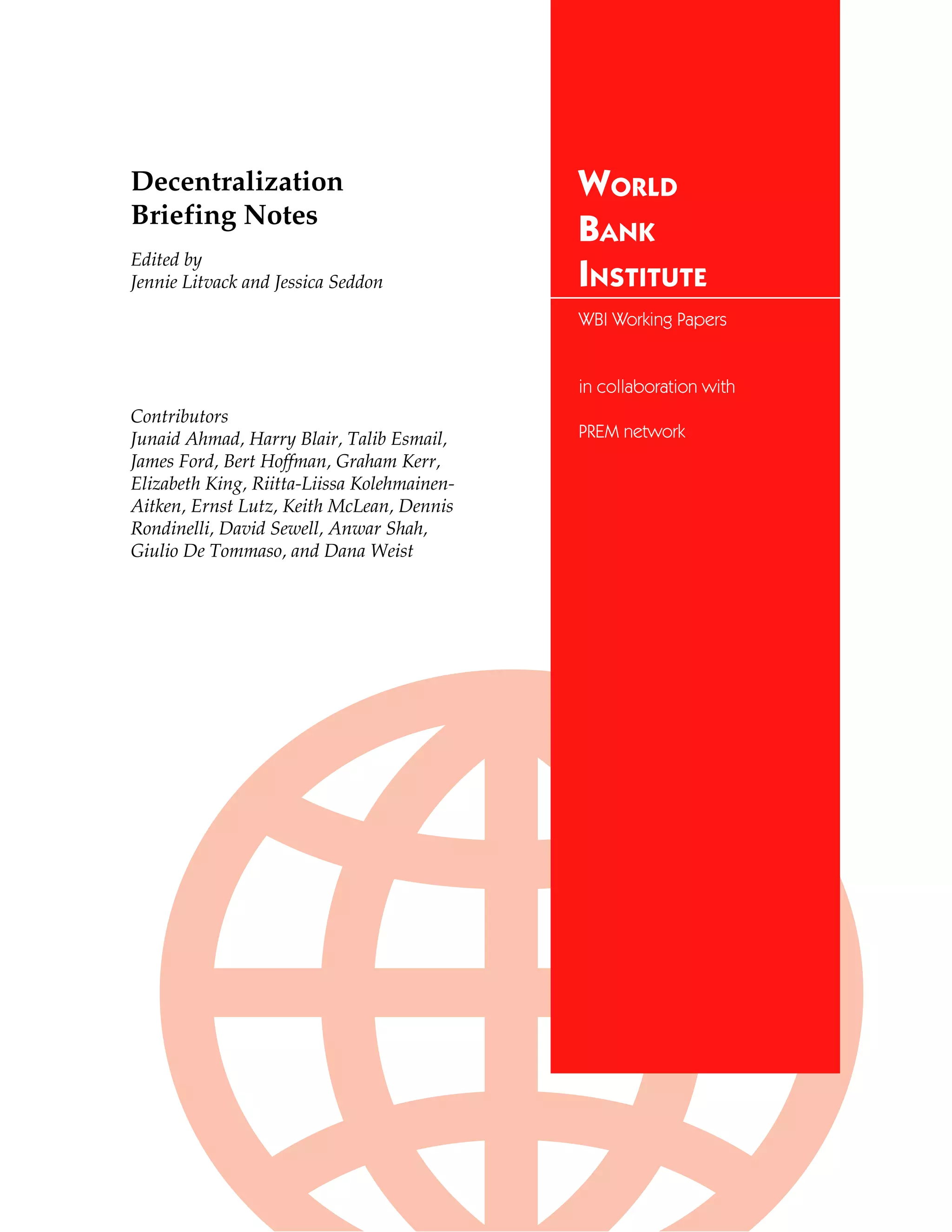 This document provides briefing notes on decentralization from the World Bank. It is divided into four chapters that cover: 1) definitions and rationales for decentralization, 2) issues in designing political, fiscal, and administrative decentralization systems, 3) impacts of decentralization on specific sectors and services, and 4) potential cross-cutting impacts of decentralization related to equity, macroeconomics, growth, and accountability. The notes are intended to highlight the broad range of issues that must be considered regarding decentralization and summarize key topics for practitioners.