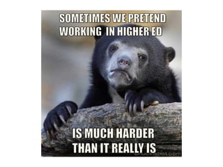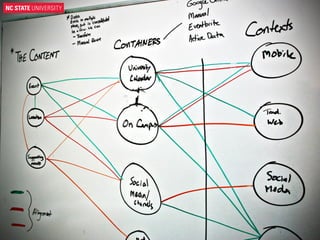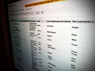 The document is a presentation by Tim Jones about content strategy and diplomacy. It encourages decentralizing bureaucracy and ego and focusing on positive goals. It notes that not everyone cares about content as much, but they care about other things. It suggests using available resources, finding patterns, making tools to solve problems, giving context, and leading by example. It advises earning authority and thinking and doing.