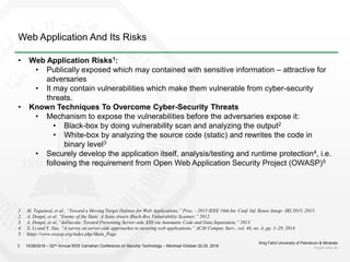 2) It outlines known web application risks and defense strategies like vulnerability scanning, secure development, and runtime protections. However, these are reactionary and do not provide long-term protection against adaptive attackers.