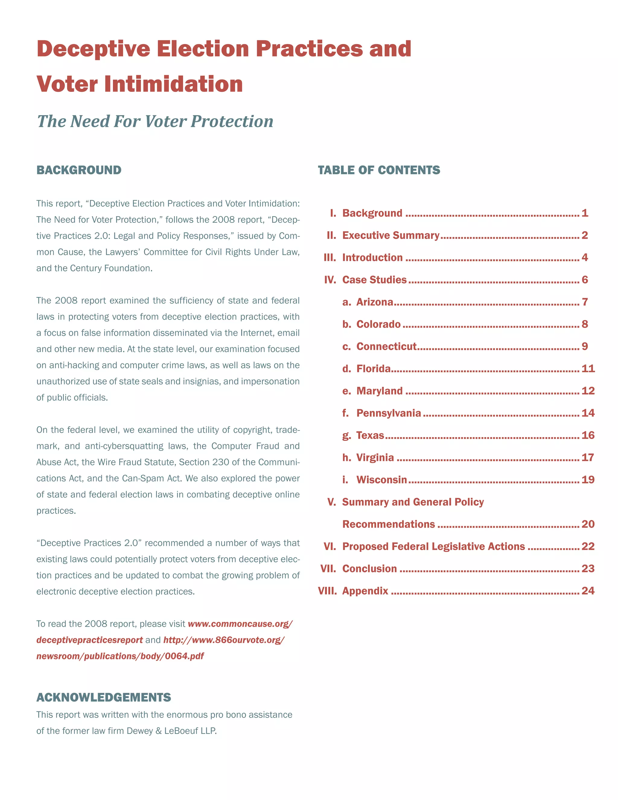 This document discusses deceptive election practices and voter intimidation tactics that aim to suppress voter turnout. It provides examples of misinformation spread to voters, such as flyers with false election rules targeting minority communities. The document calls for stronger laws to protect voters and hold accountable those who engage in voter suppression through deception. It proposes a model statute that would explicitly make it unlawful to intentionally spread materially false information about voting within 90 days of an election. Overall, the document advocates for reforms to address ongoing voter suppression and safeguard the right to vote.