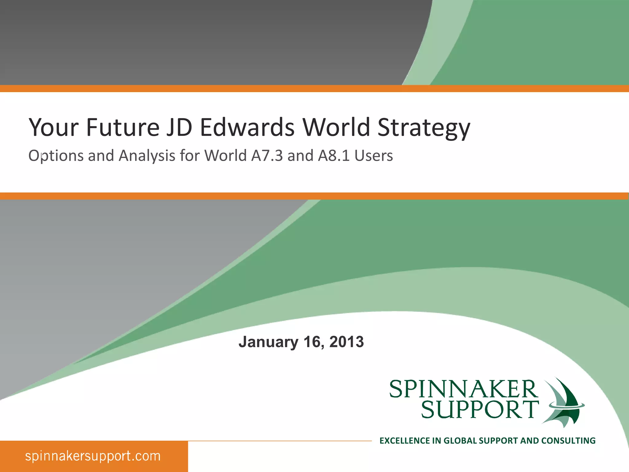The document discusses options for JD Edwards World customers facing the end of vendor support for versions A7.3 and A8.1 at the end of 2013. It outlines three decision paths: ignore the issue, wait and see what happens, or decide now on a strategic direction. Under the decide now path, the options of upgrading to A9.3, migrating to a new ERP platform, staying on the current version with sustaining support or third-party maintenance, or pursuing self-support are reviewed. Third-party maintenance is presented as an option to extend the life of the current system and realize 50% savings over vendor maintenance costs.