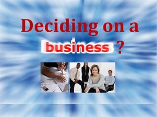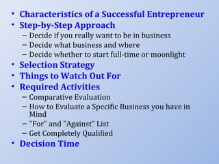 The document provides guidance on selecting and evaluating a business idea to start. It recommends deciding if you have the characteristics of an entrepreneur, determining what business and location, and whether to start full or part-time. Key steps include developing a list of potential business ideas related to your interests; conducting a comparative evaluation of top options; and getting qualified by working in the industry. The overall message is to thoroughly research and analyze options before committing to an idea.