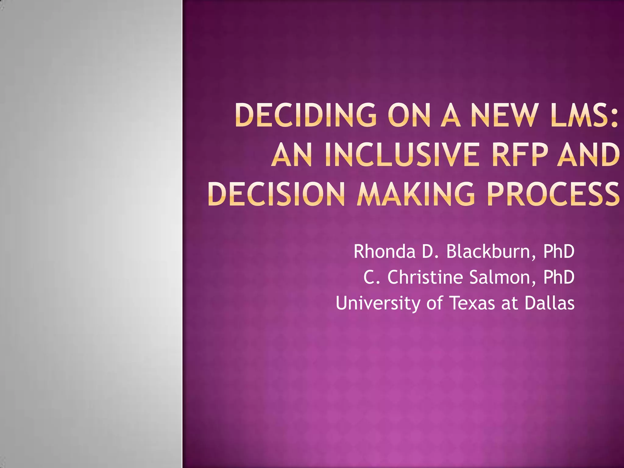 The document outlines the process undertaken by the University of Texas at Dallas to select a new learning management system (LMS). It describes forming an LMS committee and conducting an instructional technology survey and focus groups with faculty and students. An RFP was issued in March 2011 and the top three vendor responses were brought to campus. The timeline details implementation from 2011-2013, including running the new and old systems simultaneously during transition. Focus group feedback emphasized usability, integrated tools, and additional functionality needs. The outcomes note vendor presentations were made but the decision process and future training are unknown due to office support downsizing.